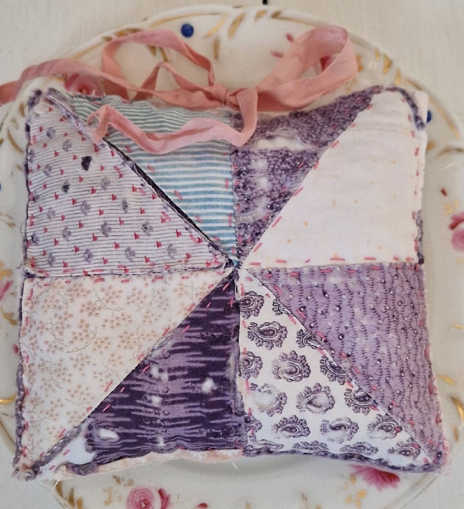 Handmade using a lovely faded & worn quilt, with handstitched repairs and pretty ribbon ties.